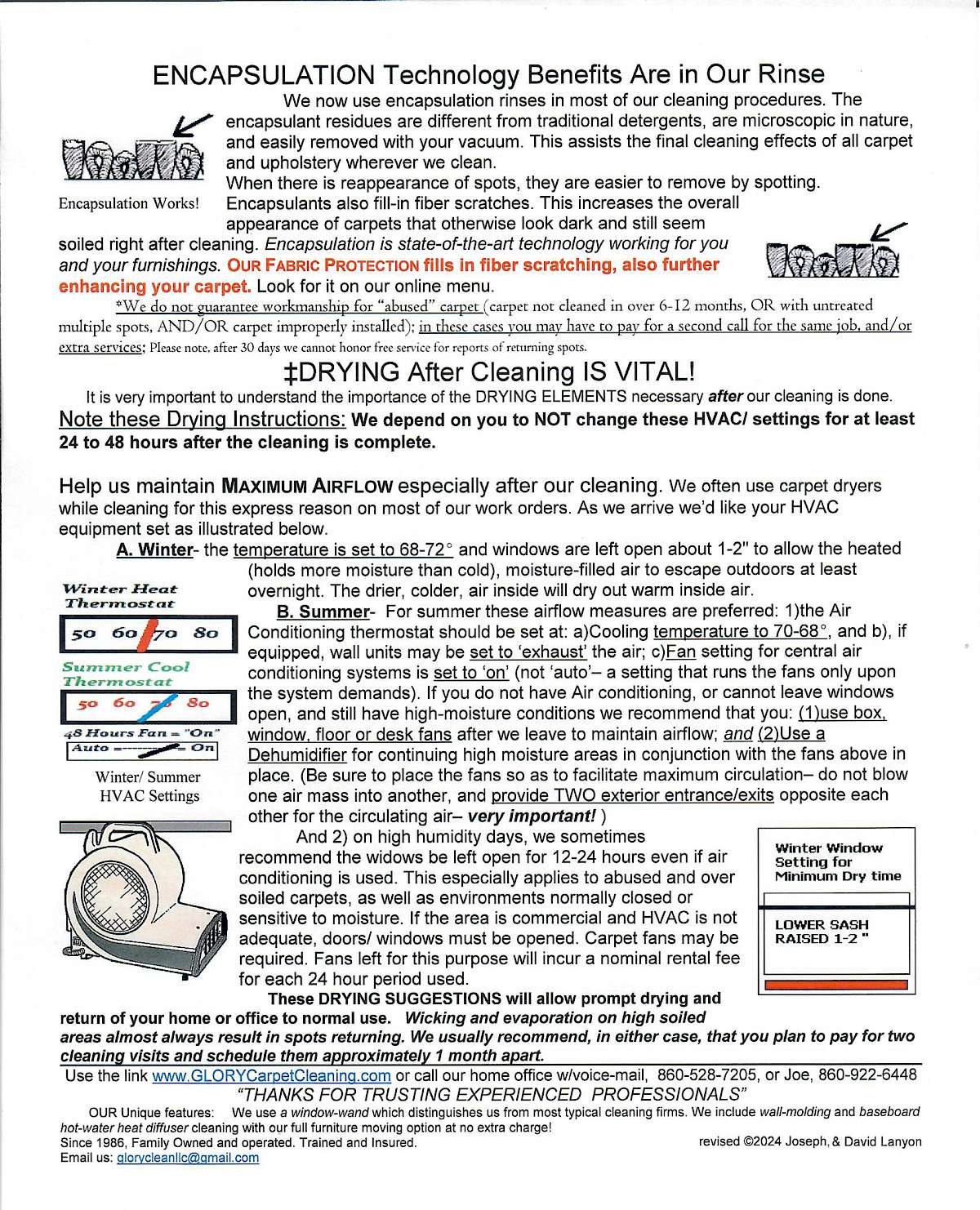 Powerful Water Extraction using an encapsulation rinsing agent that leaves carpets soft, fresh, and dry normally within 24 hours, and any microscopic soiling surfacing in final drying stages will be trapped by the encapsulation detergent and will remove the first time the carpet is vacuumed after cleaning – Agitation is used when necessary to assist the chemical and vacuum extraction process