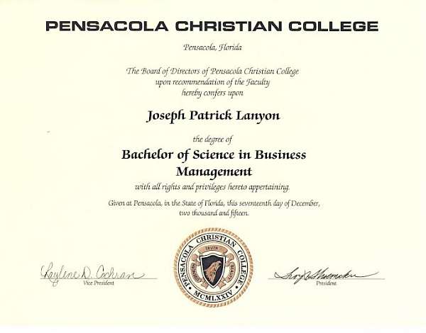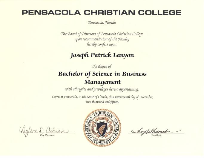 Joseph has graduated in December 2015 and celebrated his commencement in May, 2016 with a Business Management Major at Pensacola Christian College in Florida.
