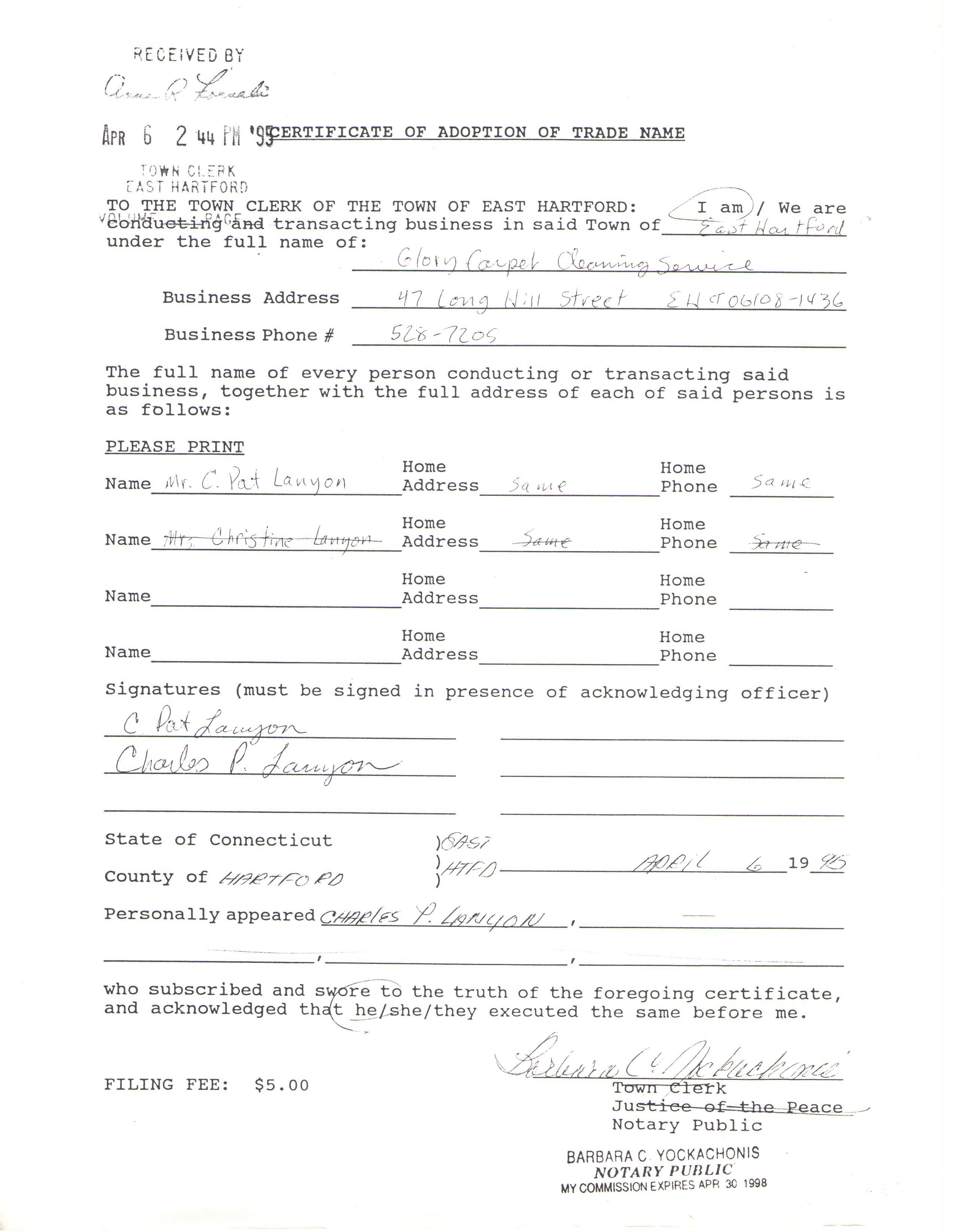 In 1995, we registered our “Trade Name” for the small fee of $5 by the Clerk of the Town of East Hartford.