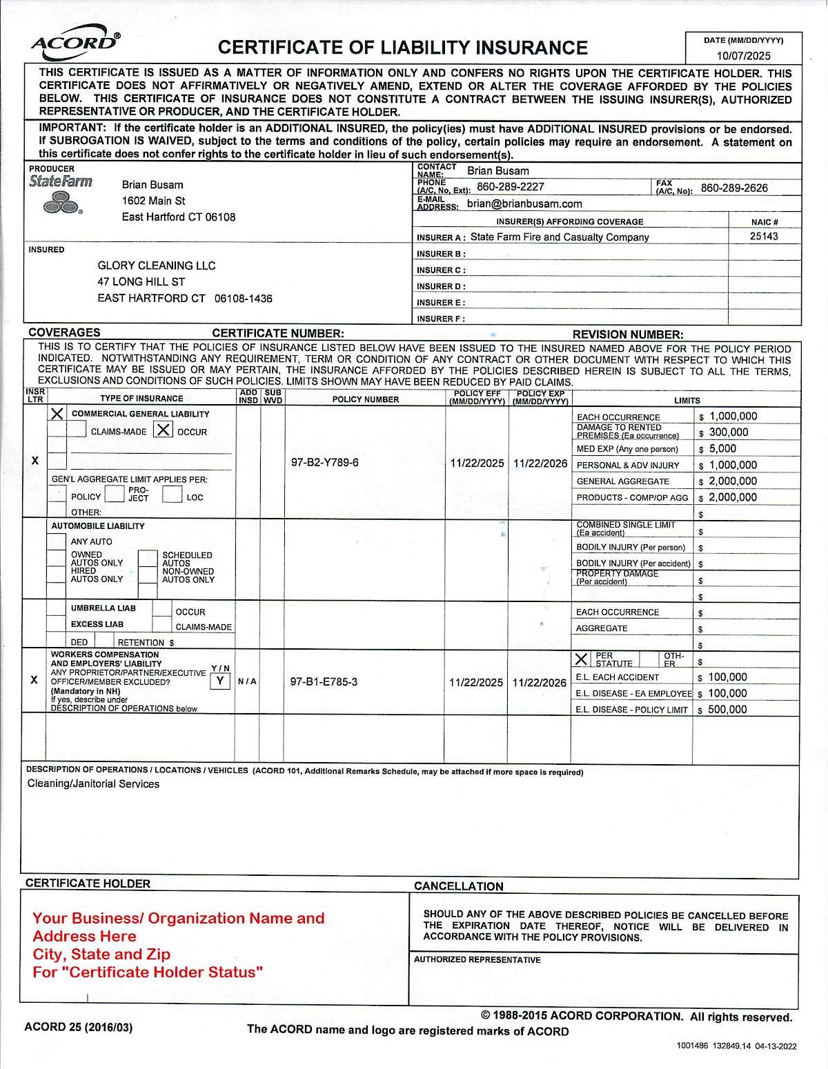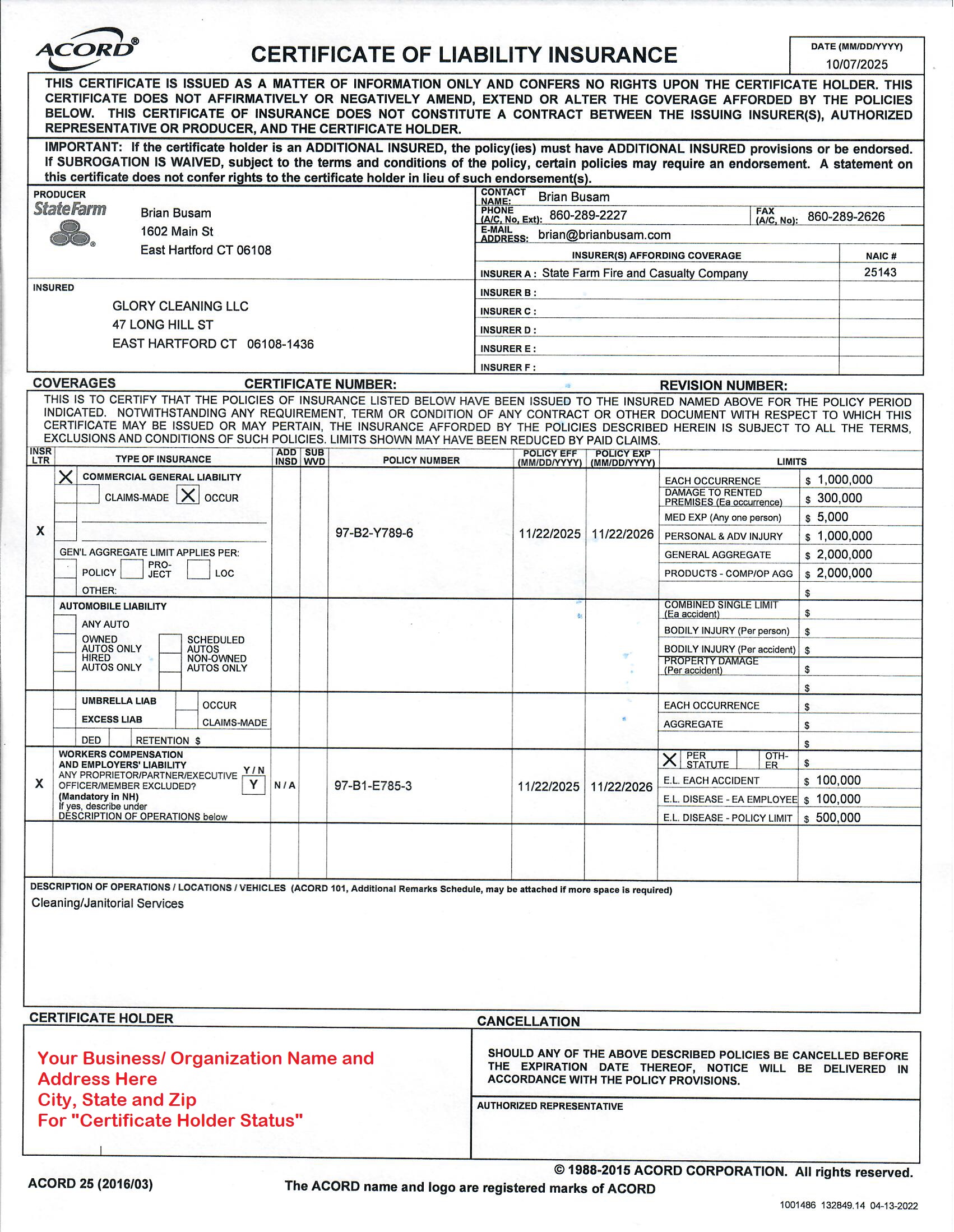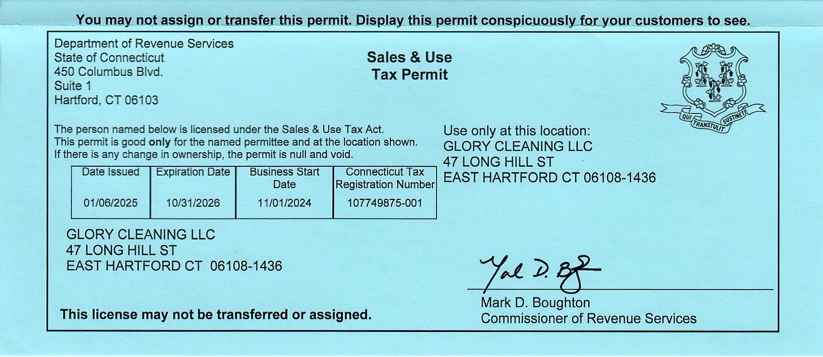 Our East Hartford Town Clerk Registration Receipt for Glory Cleaning Service