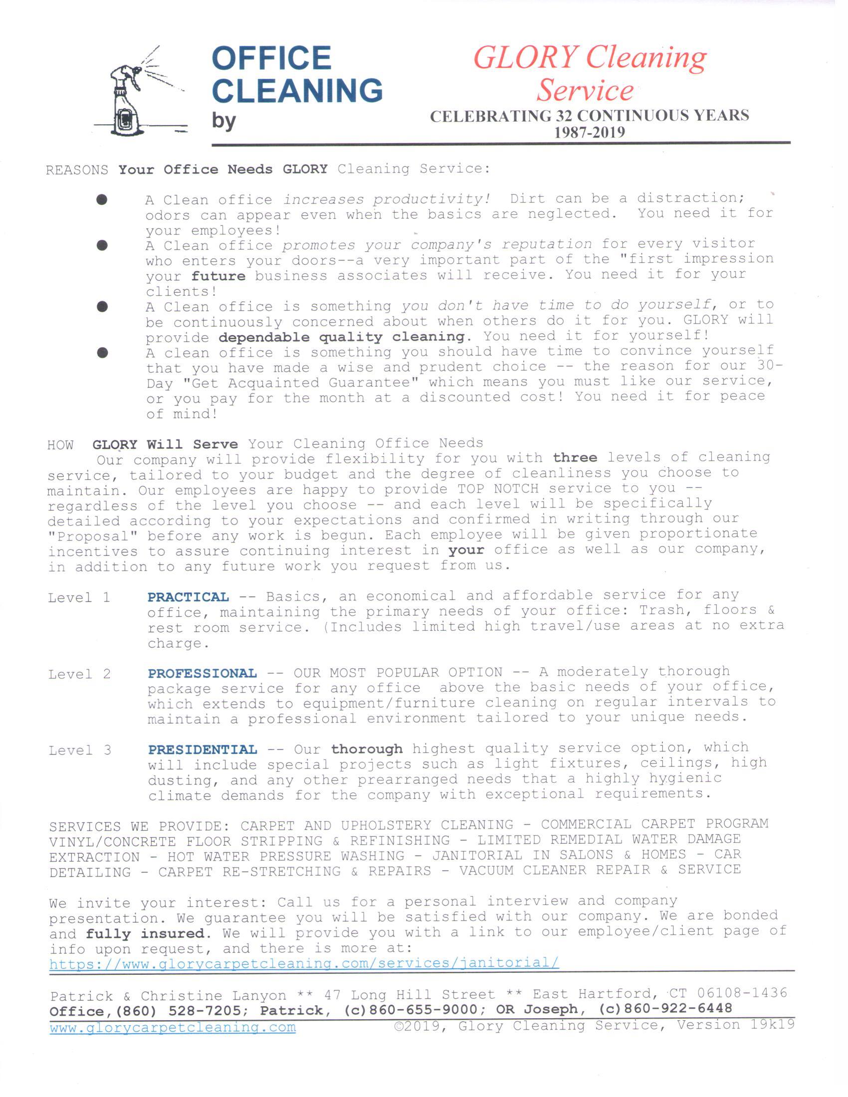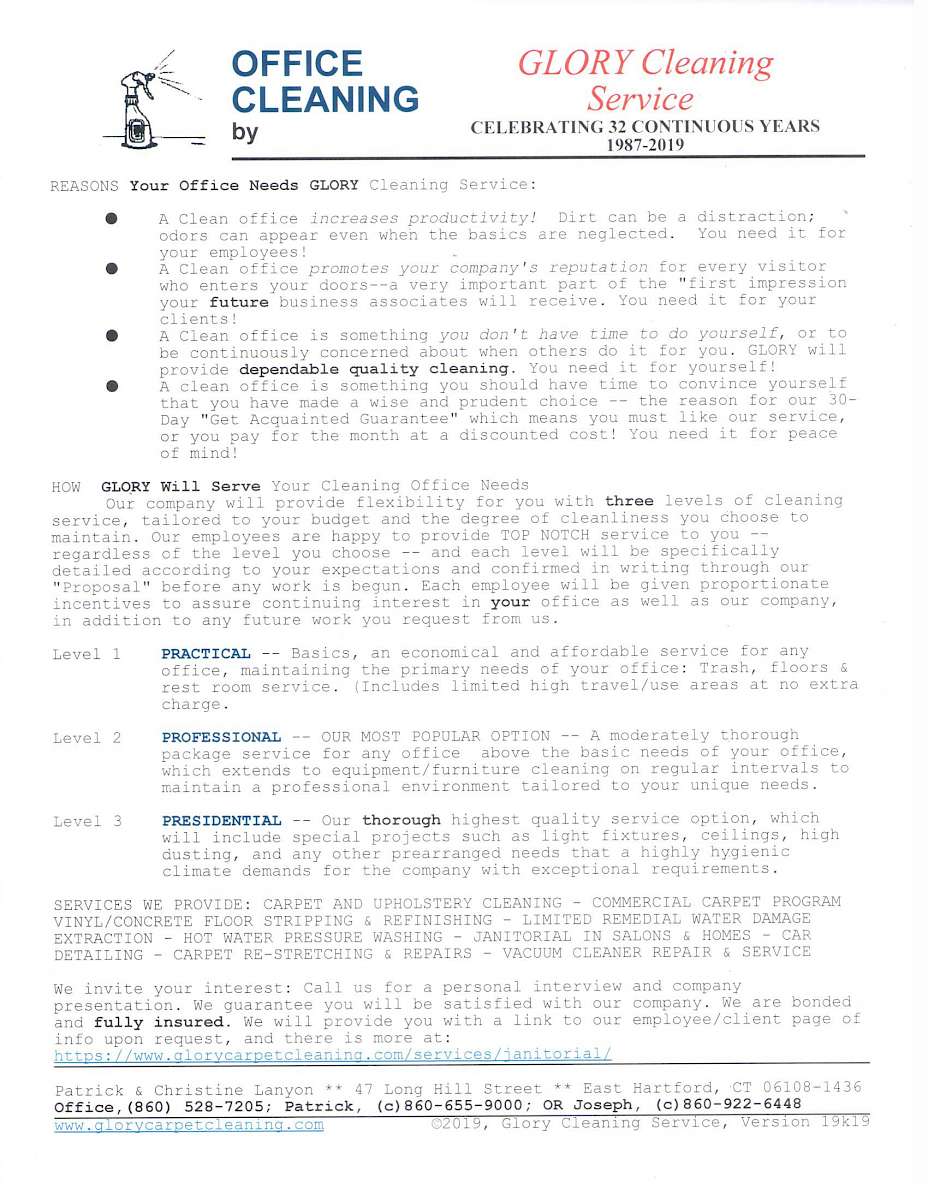 Glory Cleaning has been a family run business since inception, Nov. 1986. If possible we use family, but occasionally we use part time personnel to supplement work we get. Historically we have used full time but not recently. All applicants are required to sign a cooperation statement. We comply with all CT Dept of Labor requirements.